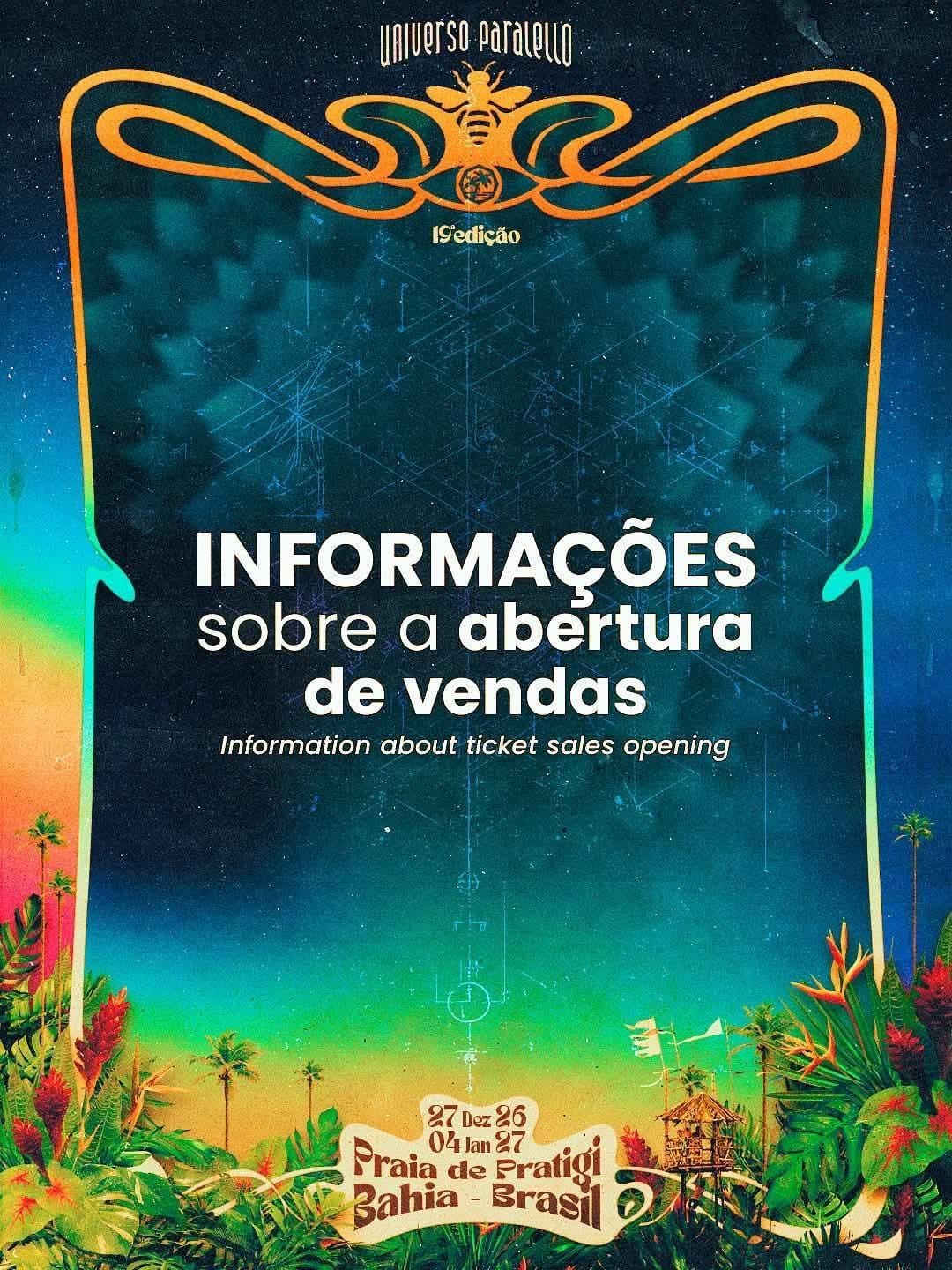 A espera está chegando ao fim. No dia 17 de setembro, às 10h10 (horário de Brasília), começam as vendas de ingressos para a tão aguardada 19ª edição do Festival Universo Paralello, que acontecerá na Praia de Pratigi, Bahia, entre 27 de dezembro de 2026 e 04 de janeiro de 2027.